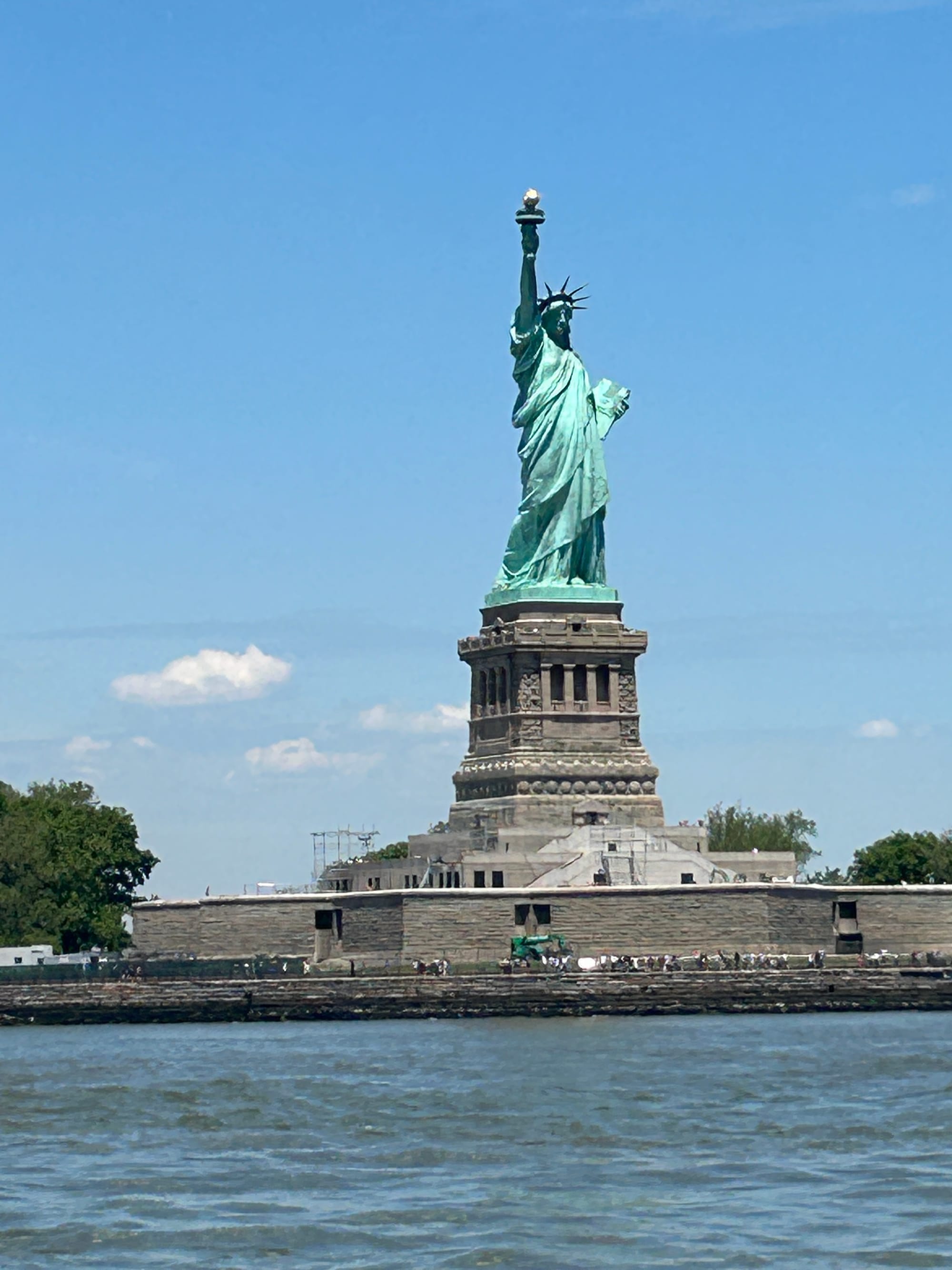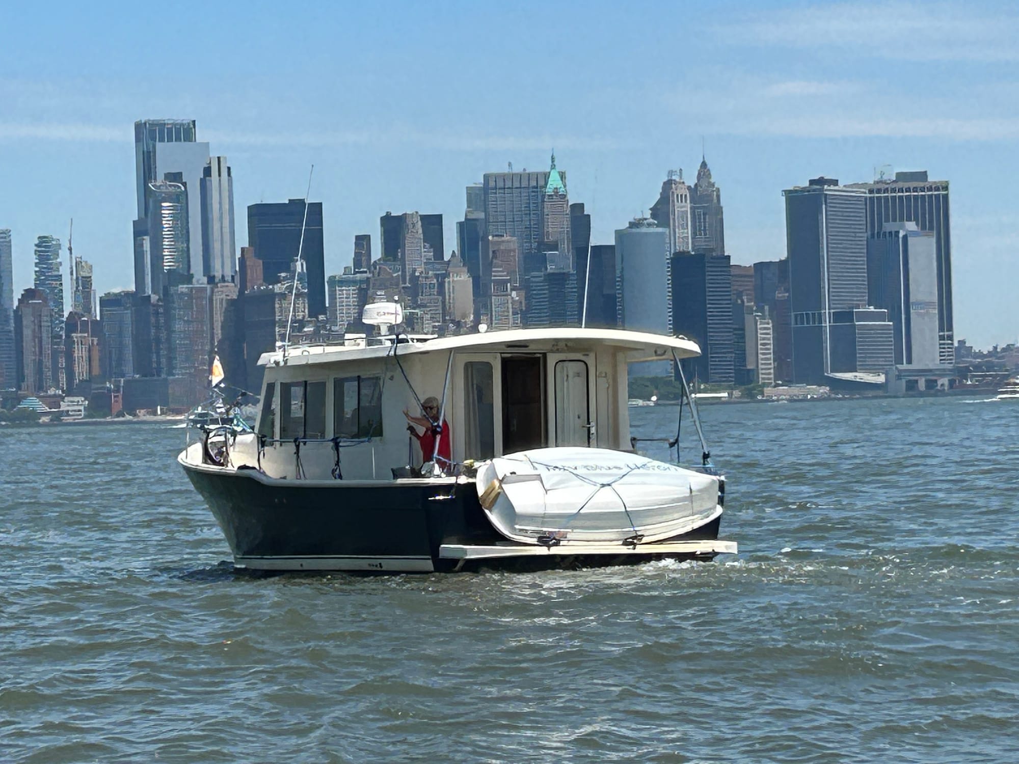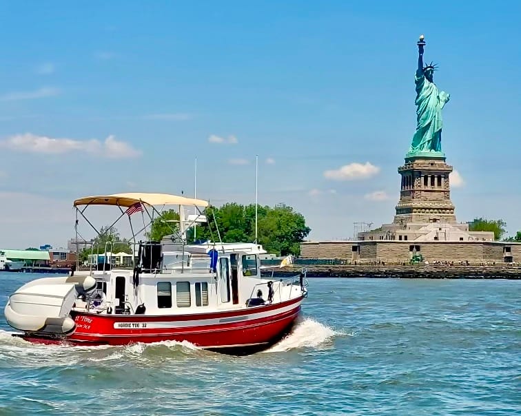Today was a picture perfect day on the water. Thank goodness as going through NYC and the East River can be very trying. We had our heads on a swivel watching for the numerous ferries, pleasure boats and tugs on the water. Unlike the beginning of our trip when we approached Manhattan we were able to see the skyline, including Lady Liberty, from miles away-pretty impressive! Several boats made the trip to NYC today including the crew from Blue Tortuga who were gracious enough to wait for our slow tug to cross in front of the Statue to take our pictures.