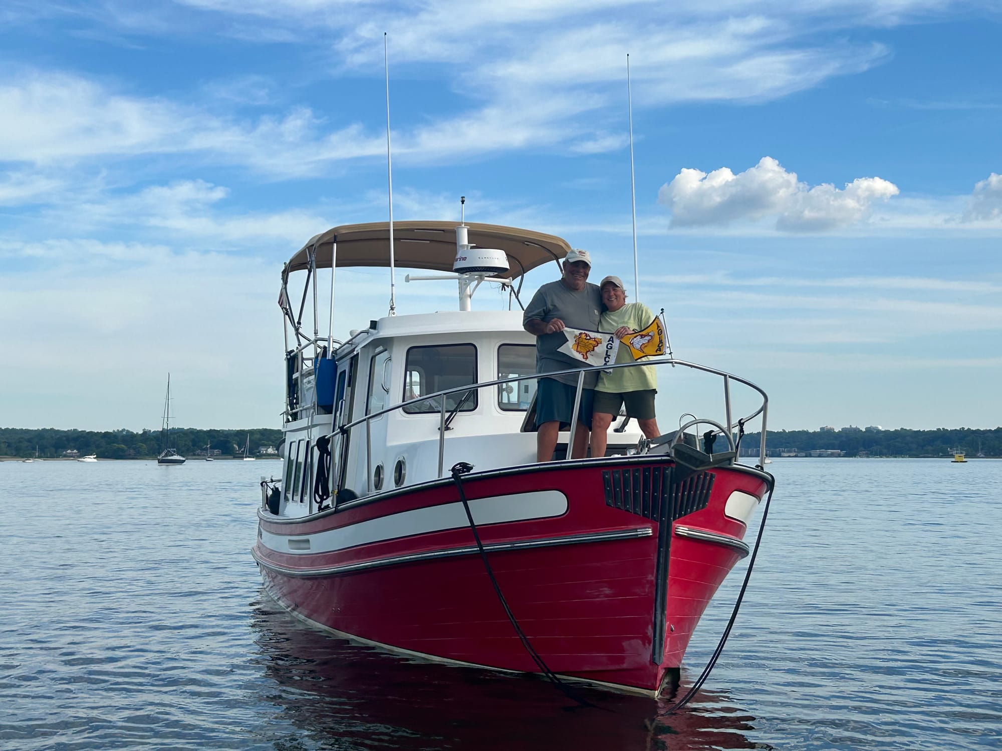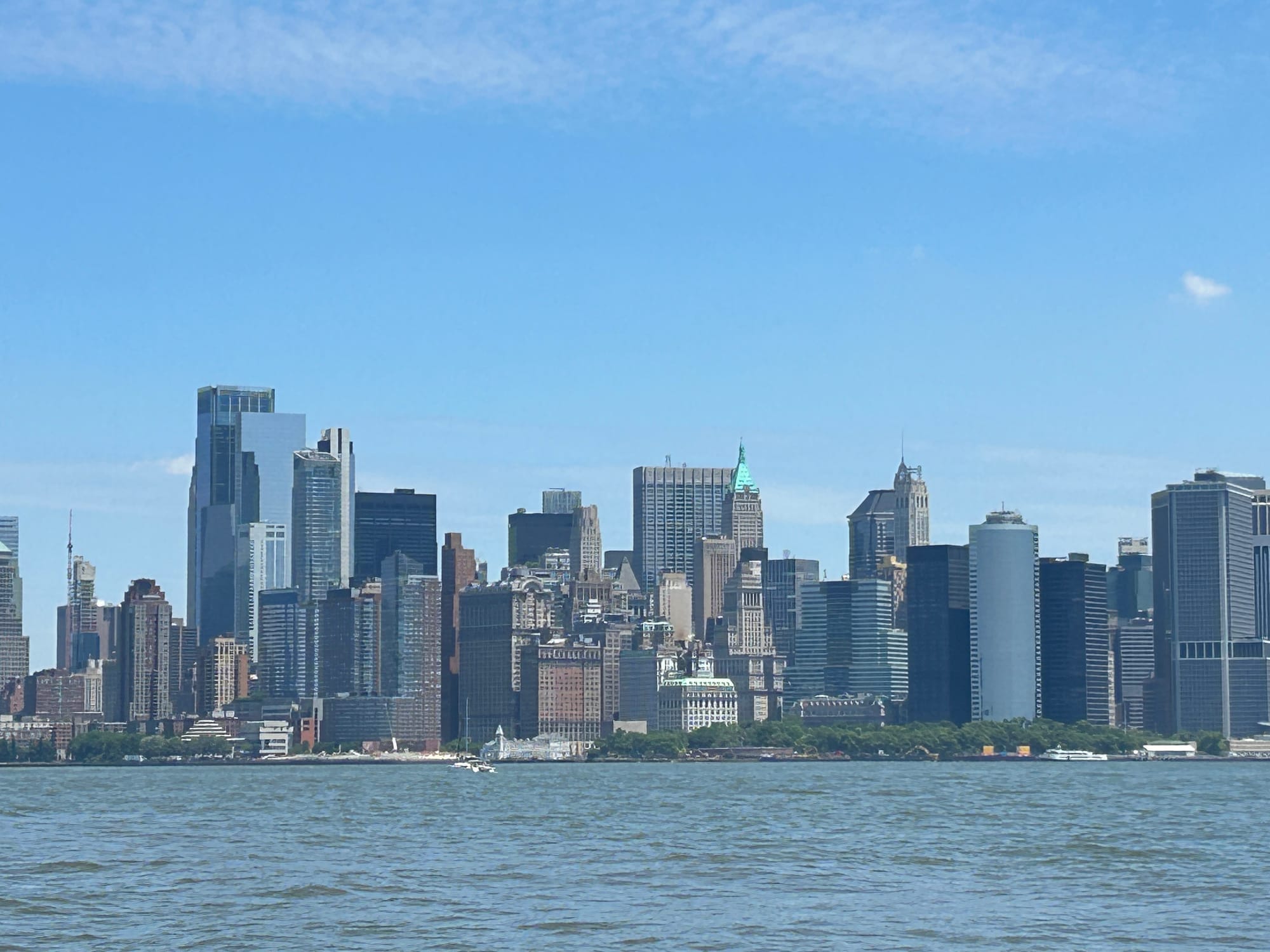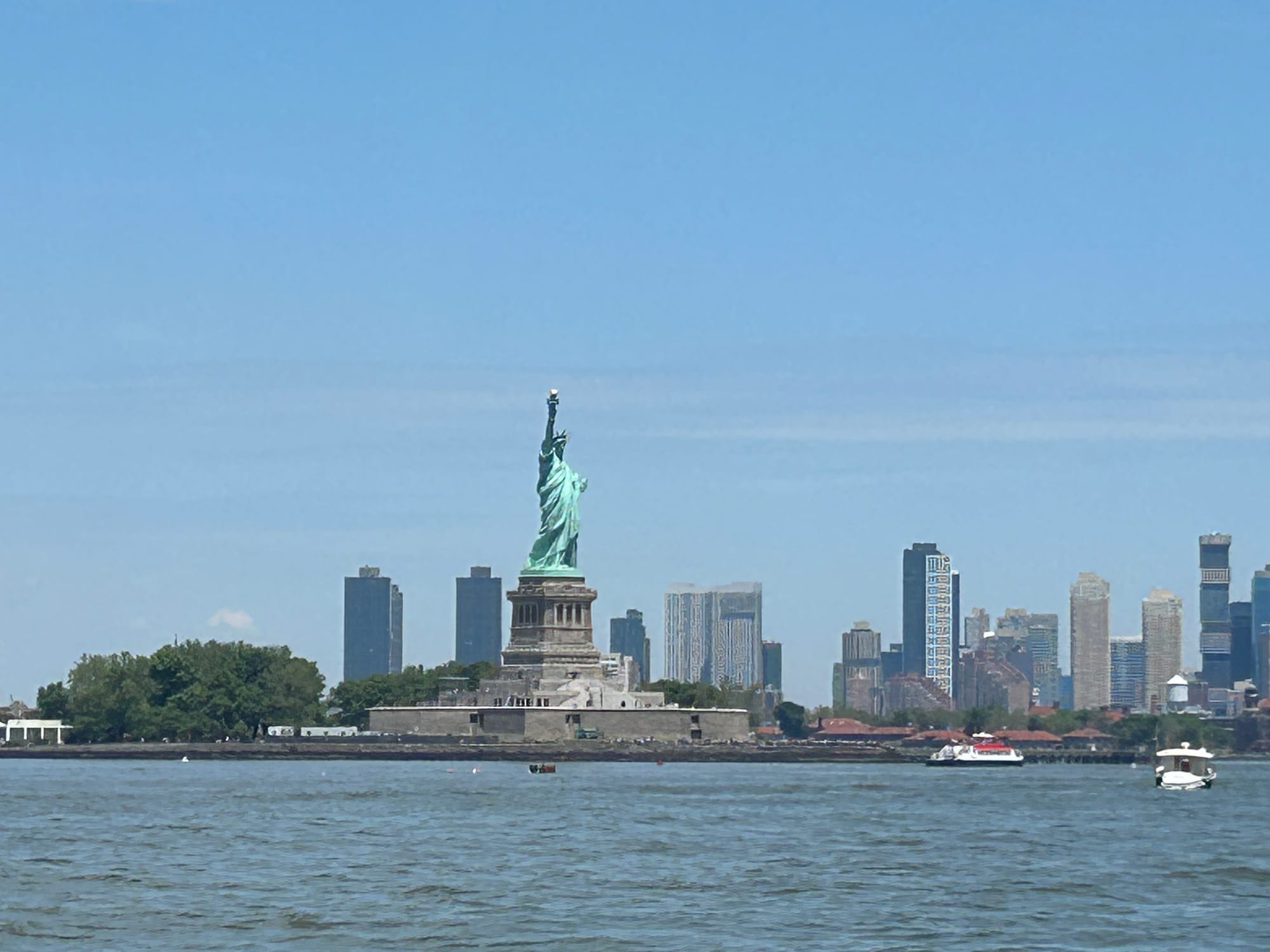 Today was a picture perfect day on the water. Thank goodness as going through NYC and the East River can be very trying. We had our heads on a swivel watching for the numerous ferries, pleasure boats and tugs on the water. Unlike the beginning of our trip when we approached Manhattan we were able to see the skyline, including Lady Liberty, from miles away-pretty impressive! Several boats made the trip to NYC today including the crew from Blue Tortuga who were gracious enough to wait for our slow tug to cross in front of the Statue to take our pictures.