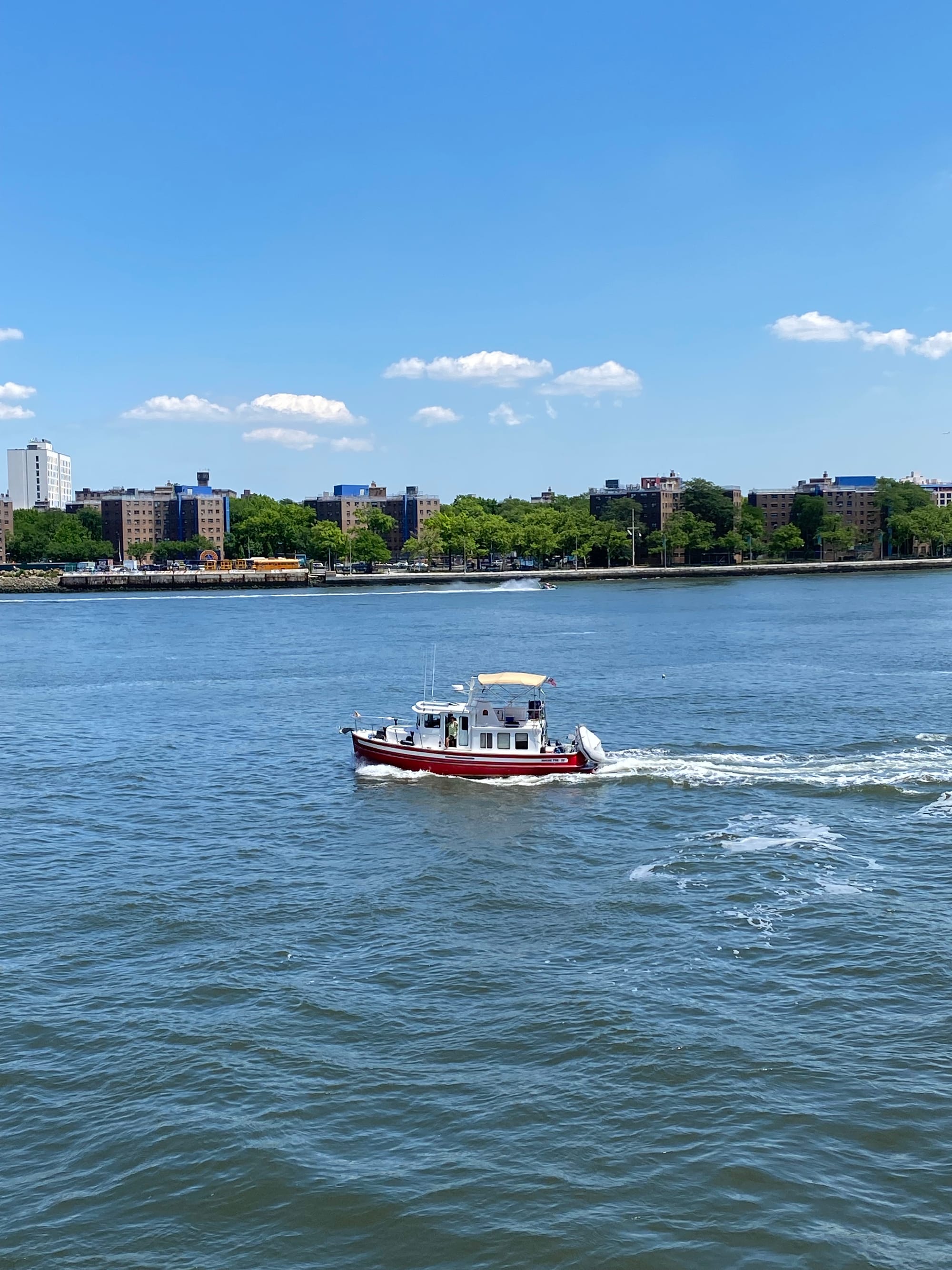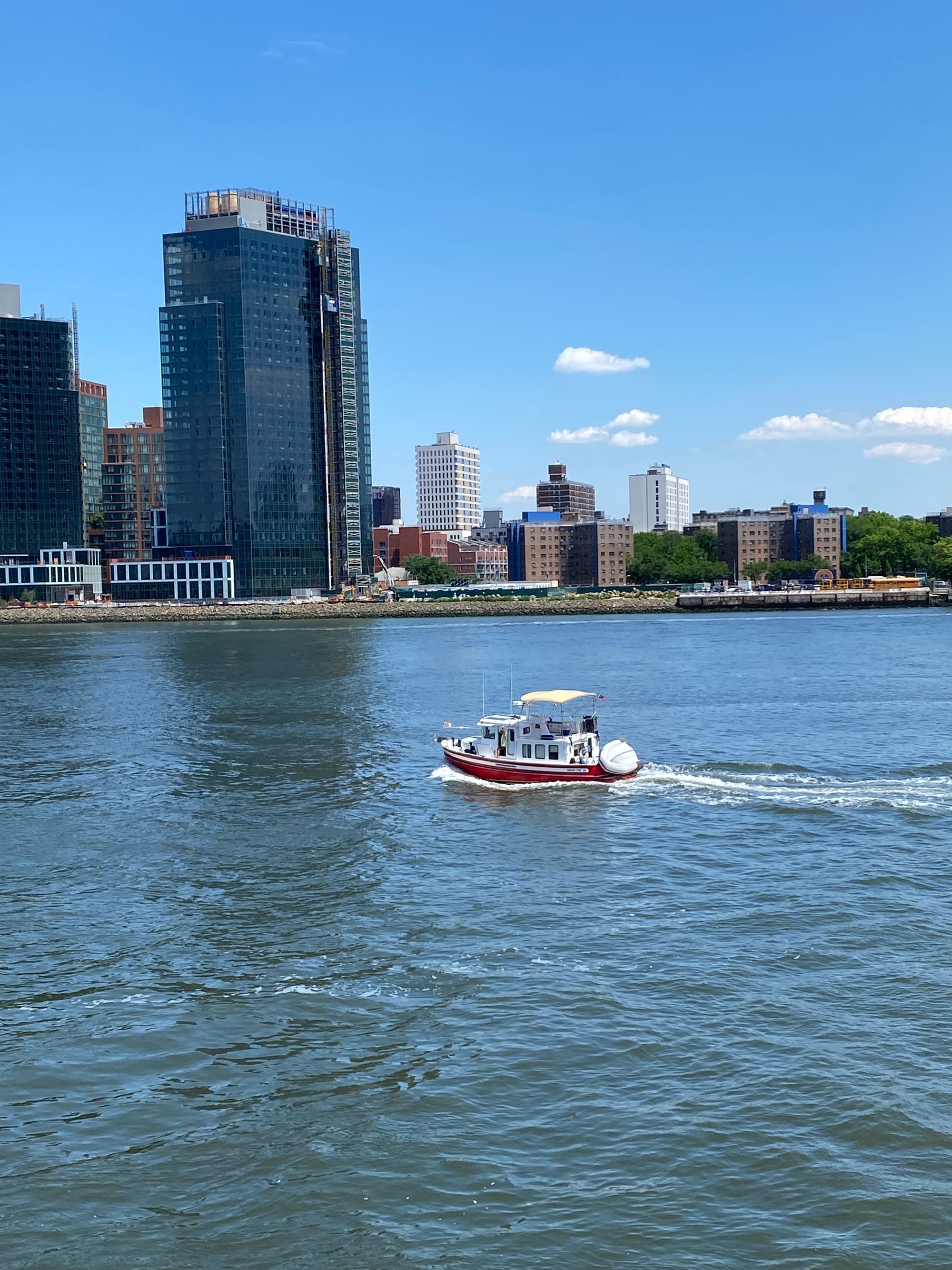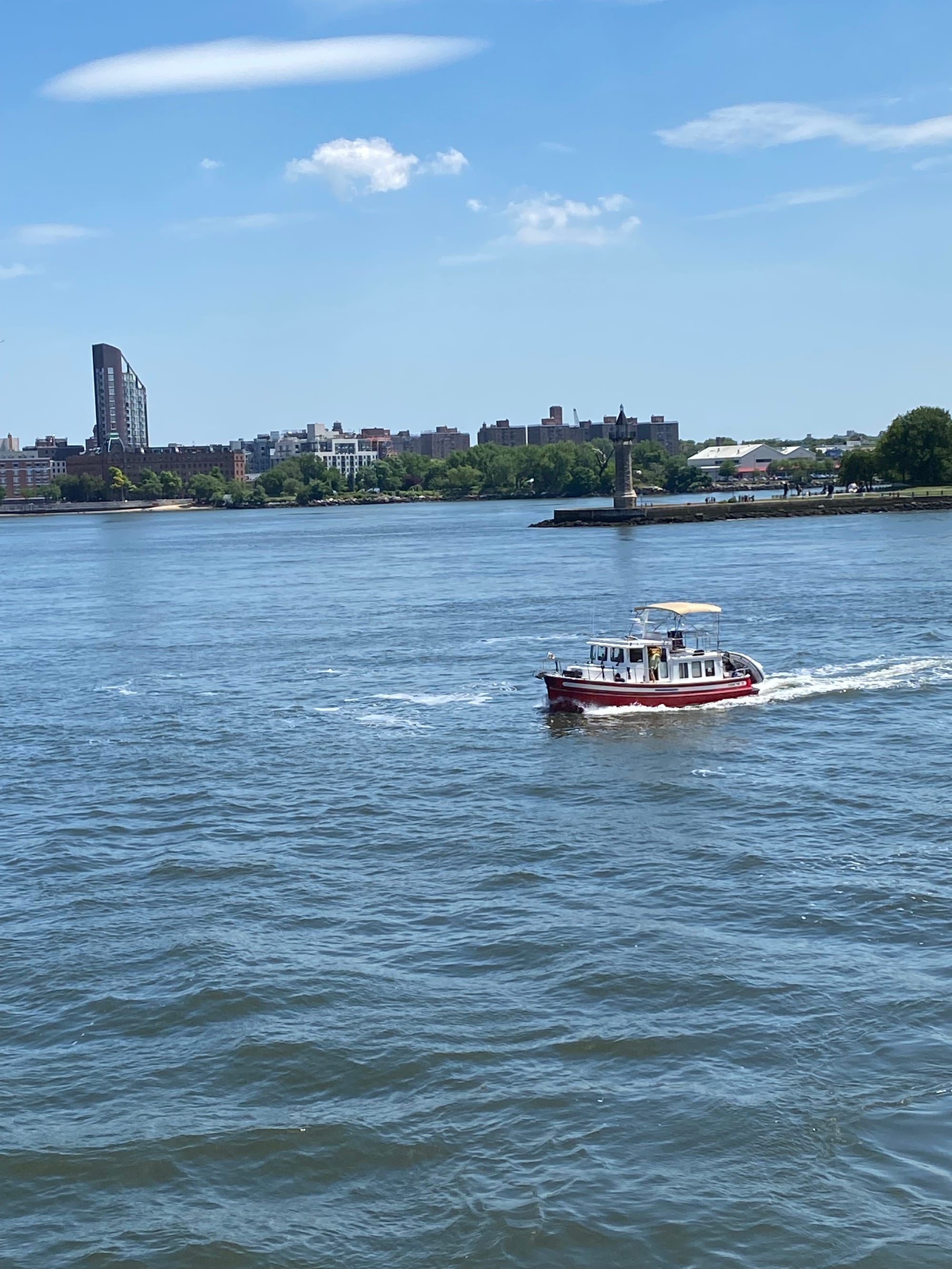 As a goof I texted my niece Caroline and asked if she was going to wave as we went by today. As many of you know I am directionally challenged and had no idea where she lives in NYC in relation to where we would be coming through the city. As luck would have it we passed Roosevelt Island on the side near where she lives. She was happy to oblige and as she waved frantically from shore she took a few pictures of us passing by.
