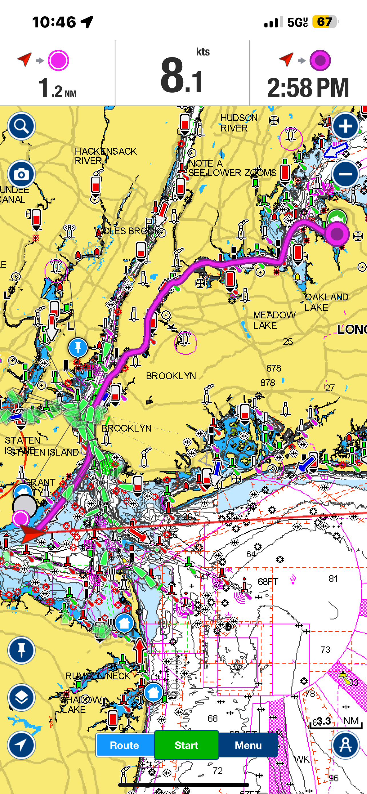 Our trip on day 348. Check it out. Yes, all those green markers are boats sharing the river with us! Busy day on the water.