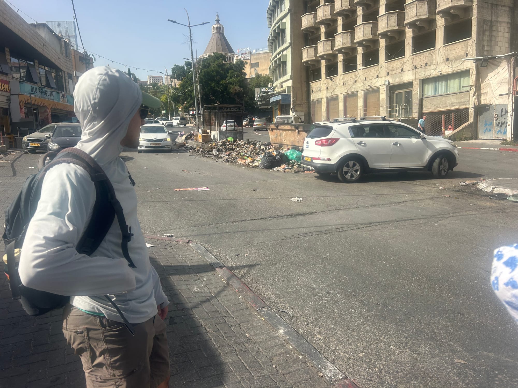 It was another hot day. Driving on narrow, winding roads through the city we soon found a parking space near the church. After a tour of the church we, of course, went out to lunch at a restaurant recommended by one of Orly‘s friends. The walk through Nazareth was quite sad as there is a dispute regarding trash disposal. The streets were full of trash, some obviously had been burned in the streets.