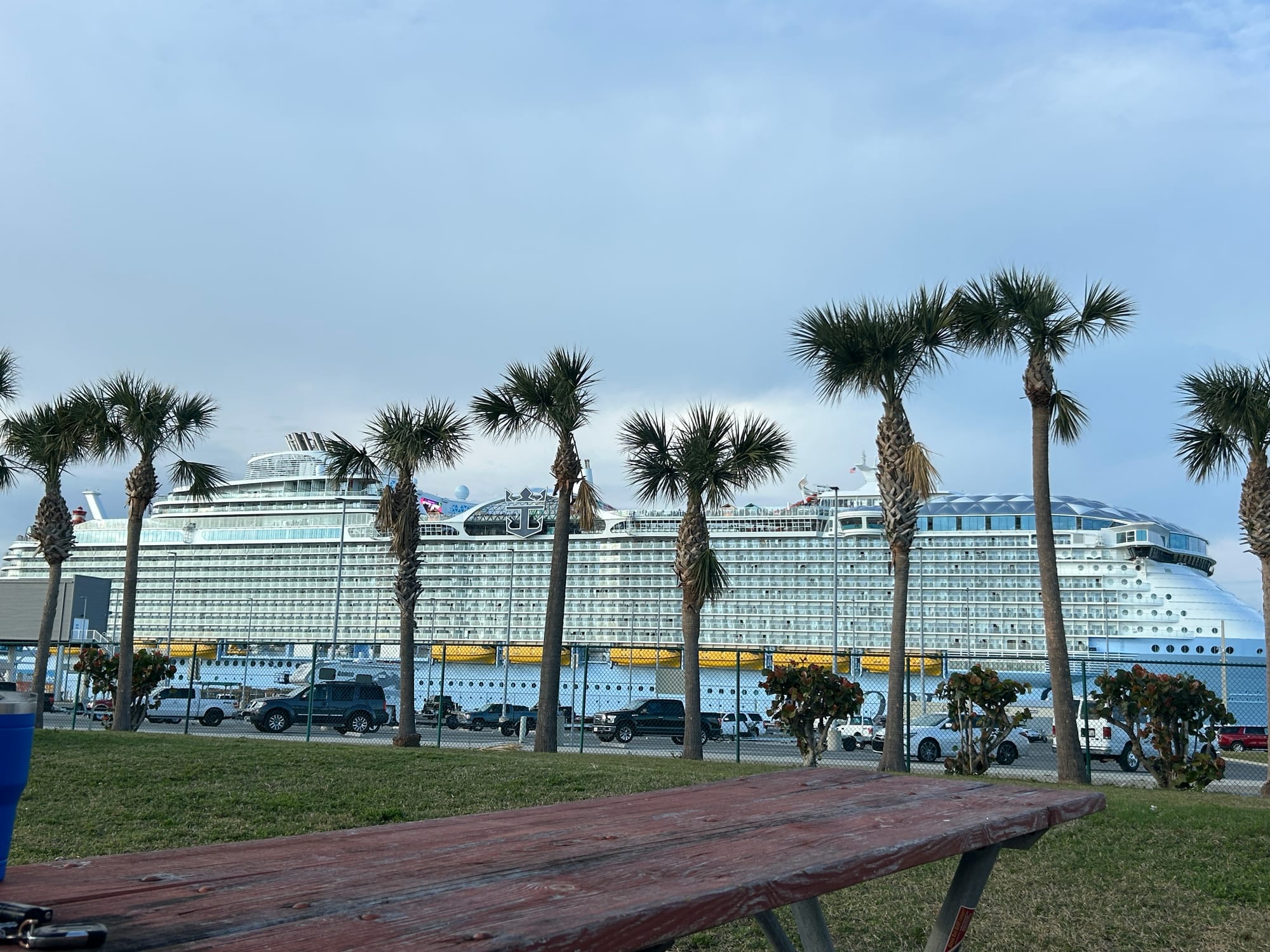 We were lucky to get a camping spot near the water at Jetty Park. The park was right on the water a short walk to the beach and jetty. The only drawback was the noise and blocked view from the enormous cruise ships that dock here awaiting trips to the Bahamas. (See photo bottom right).