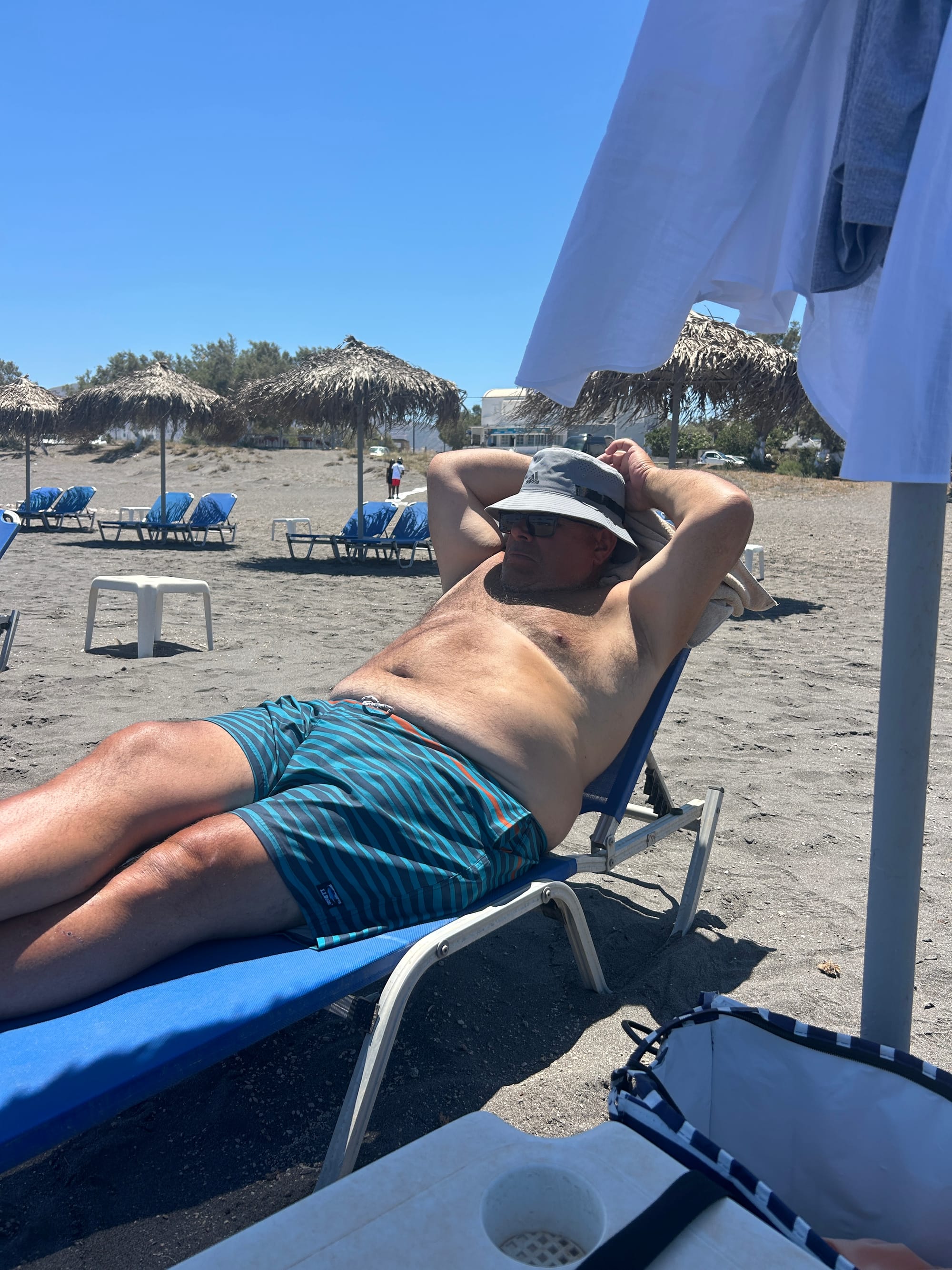 We stayed on the "quiet side" of the island near Kamari beach known for its black sand. Although a beautiful beach, its volcanic rock makes it a difficult entrance to the water. Later in the week we found Monolithos beach. The same interesting black sand but soft and easy to enter. This is a quiet beach, less tourists, more locals.